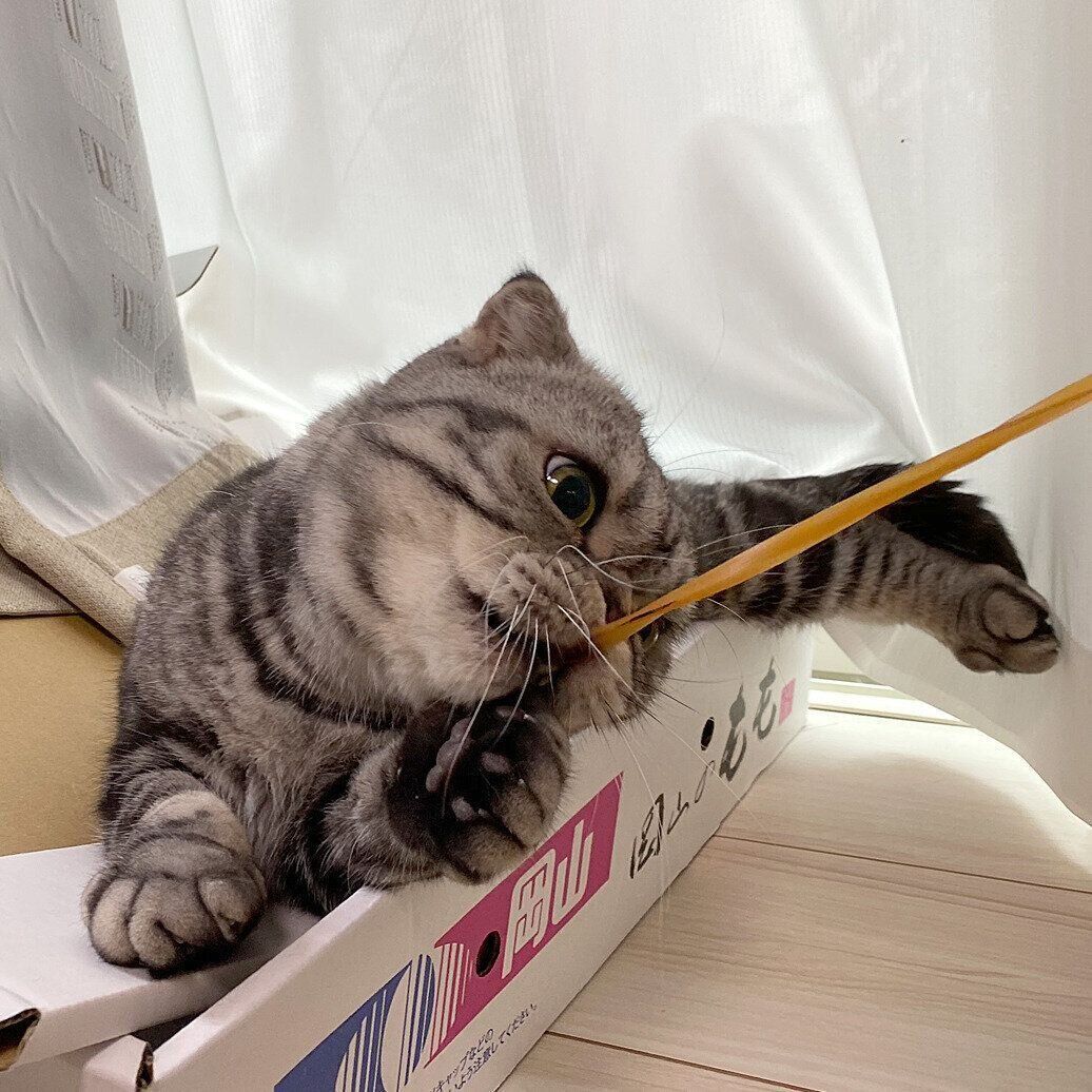 ゴムを見つけたししまるは、箱へ持ち帰ると一人で遊び始めたのでした。