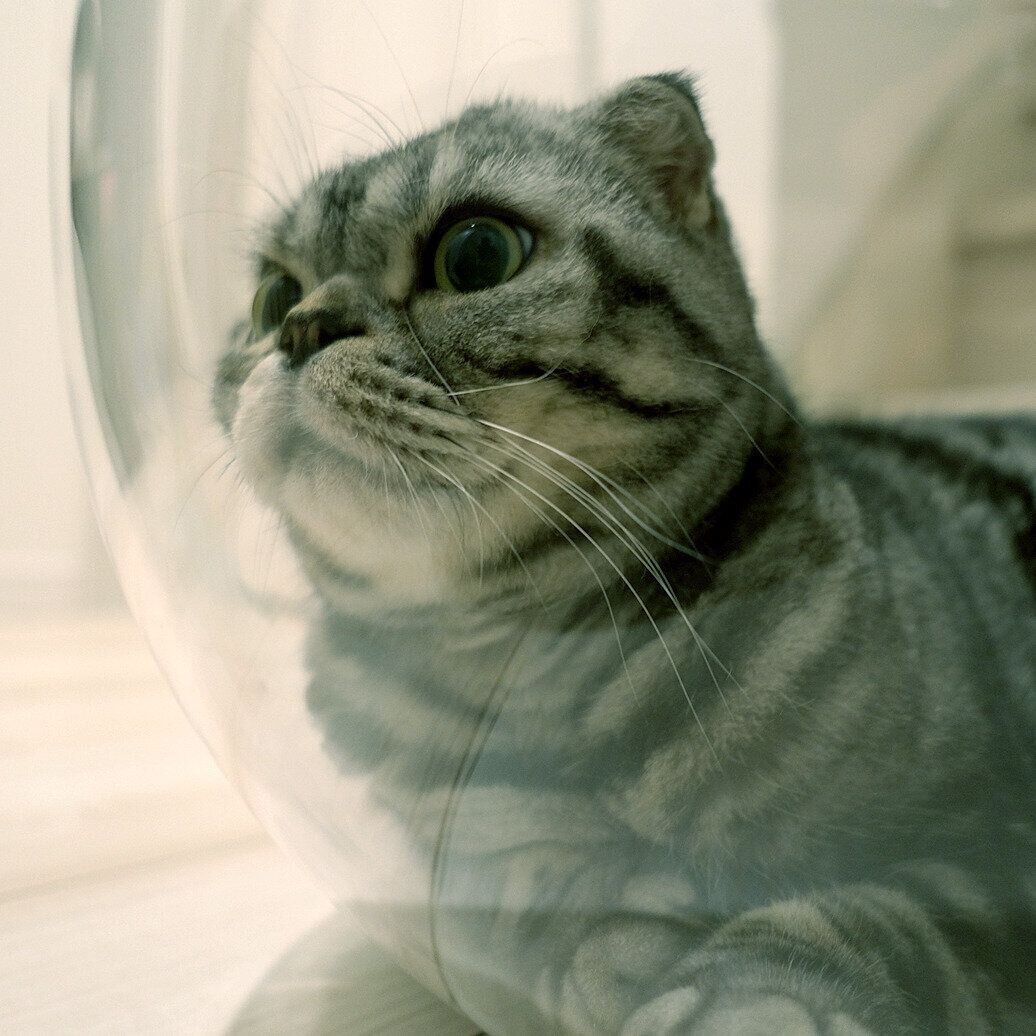 眺めている内に、水槽の丸みが宇宙服のヘルメットに見えてきて、宇宙を漂うししまるを想像しました。「2020年宇宙の旅」です。