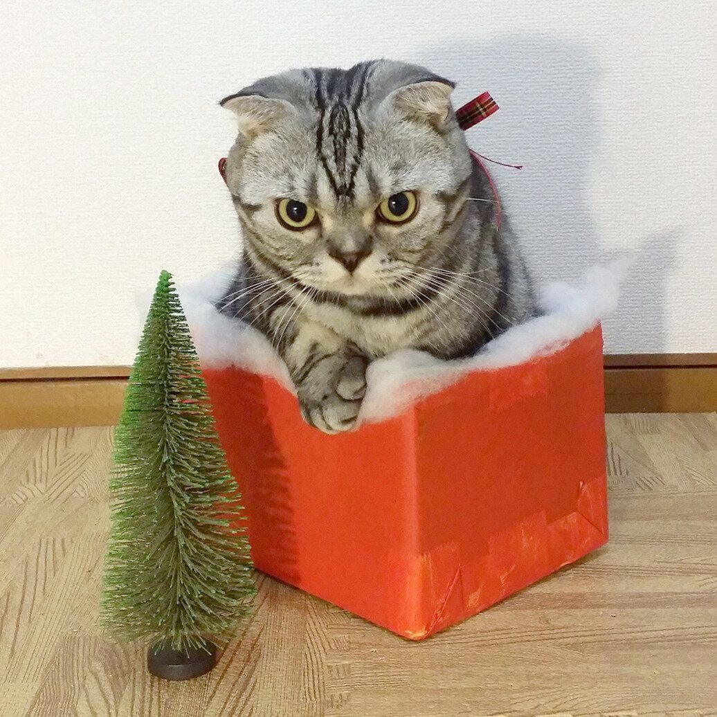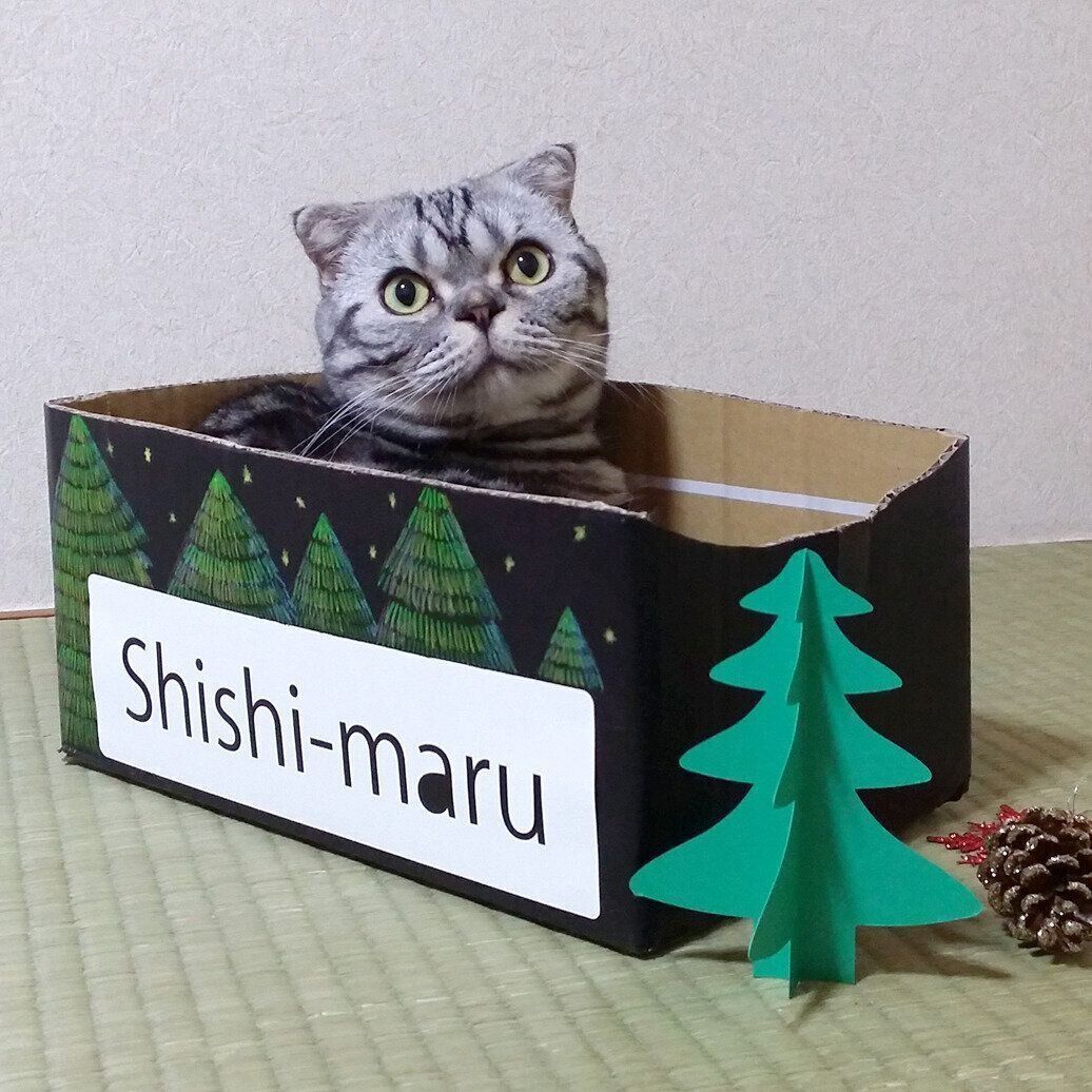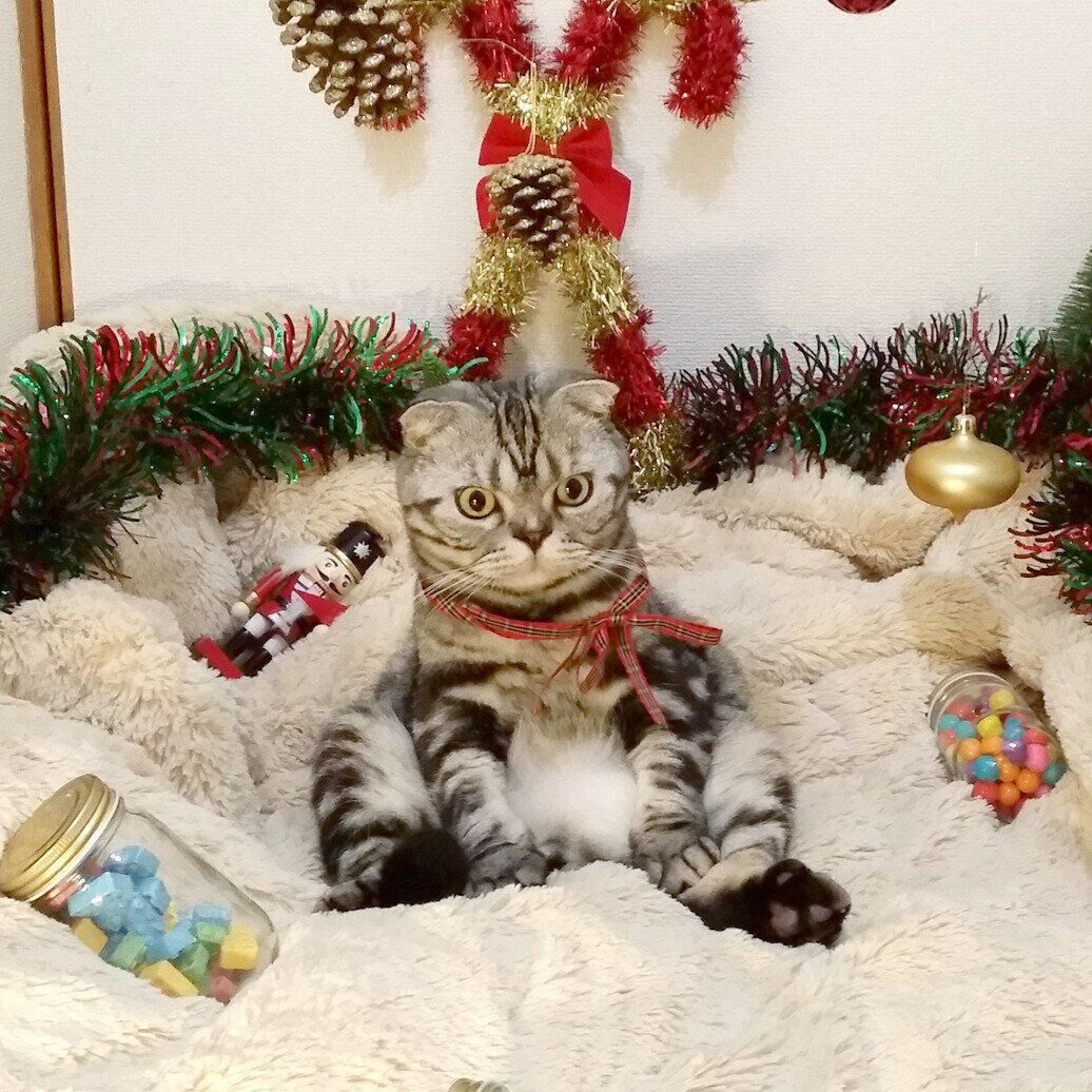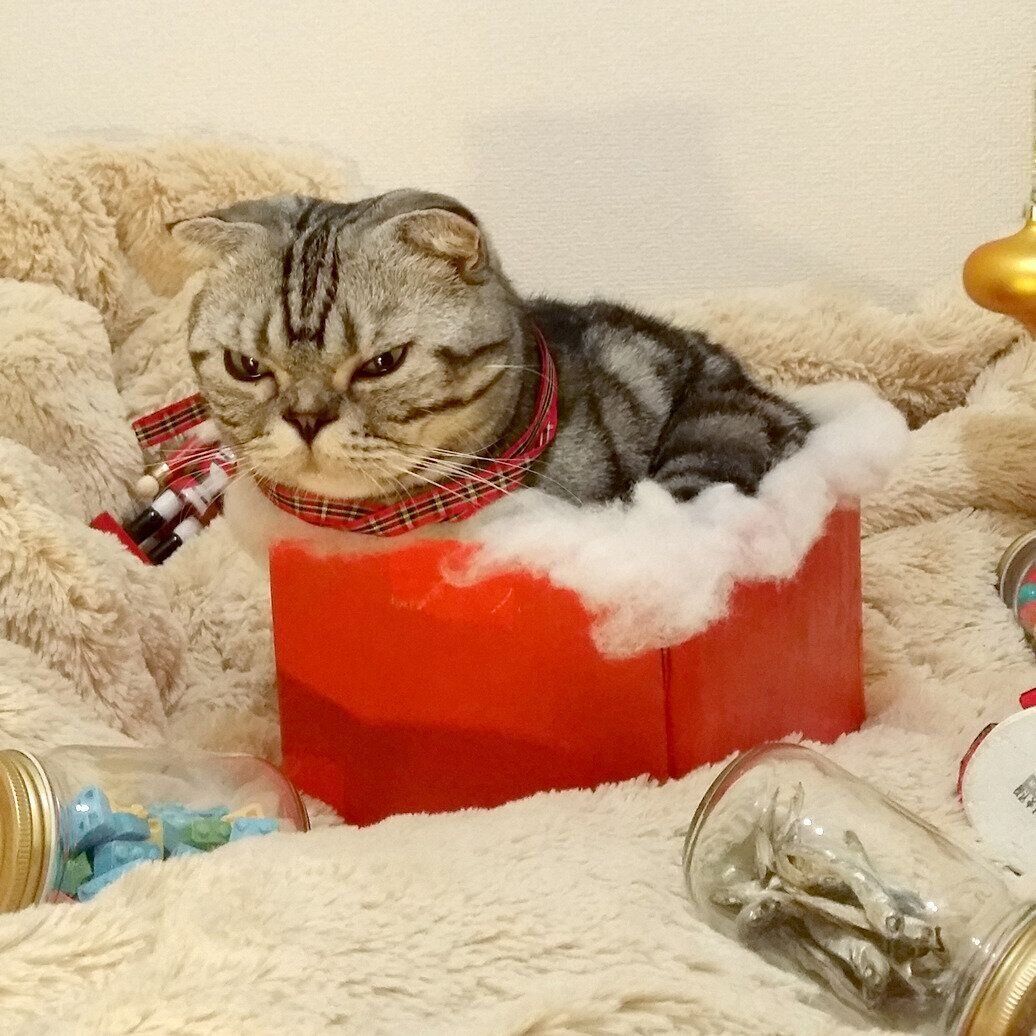 毛布を雪に見立てたり、空き瓶に煮干しを詰めたり、ししまるが好きな箱をクリスマスカラーに塗ったり…最終的には手作り感あふれるクリスマス写真になりました。