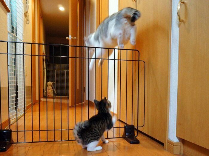 まぁでもそのかっこいいジャンプも、キッチンを囲っているゲートを飛び越えて中に入り、イタズラしたい一心で編み出したワザなんですけどね。