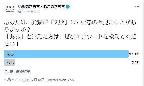 今回、いぬ・ねこのきもち公式Twitterでは、飼い主さんが目撃した愛猫のおもしろ可愛い「失敗」の瞬間エピソードをお伺いしました!
