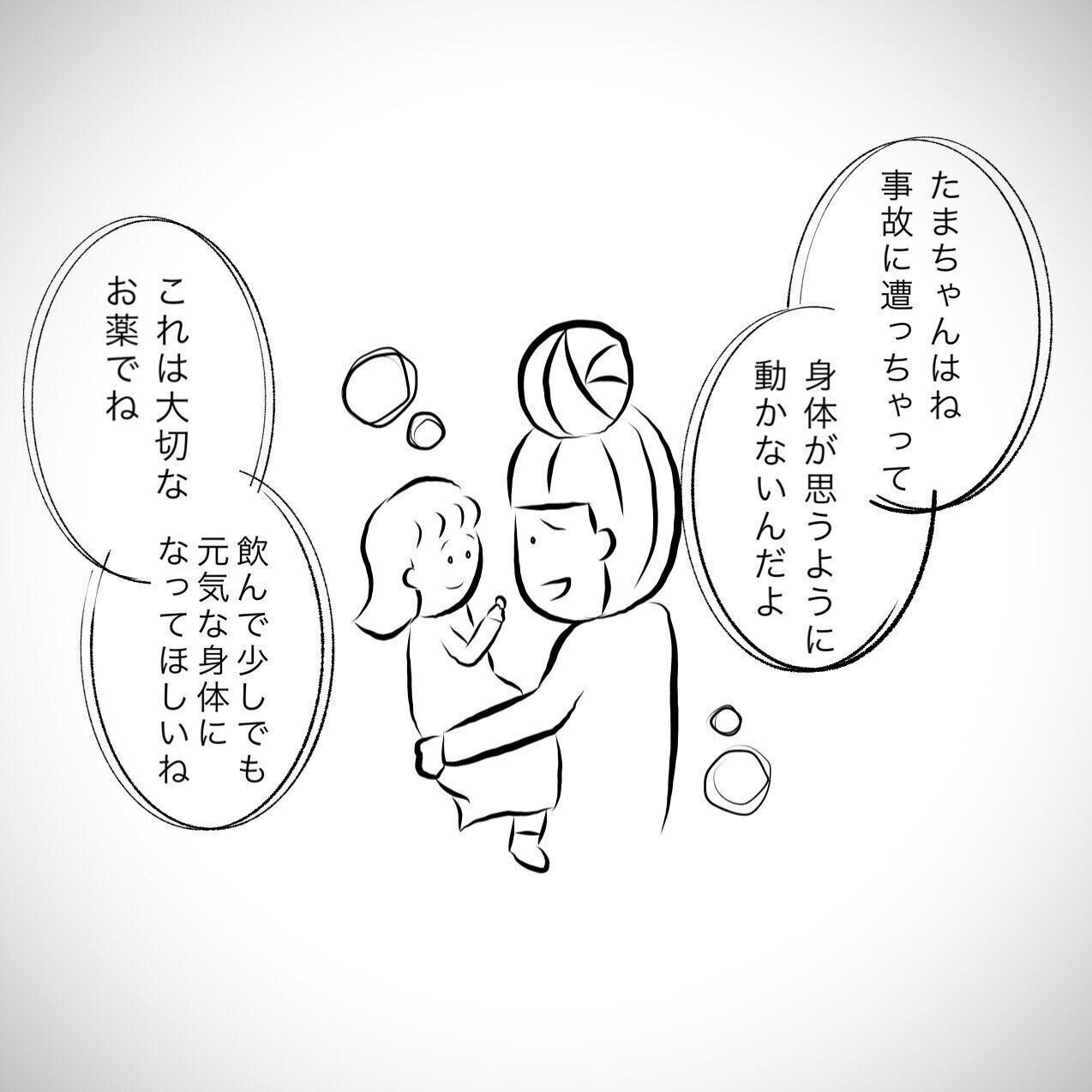 これは、大事なお薬なんだよ。これを飲んで早く元気な身体に戻って欲しいね!"