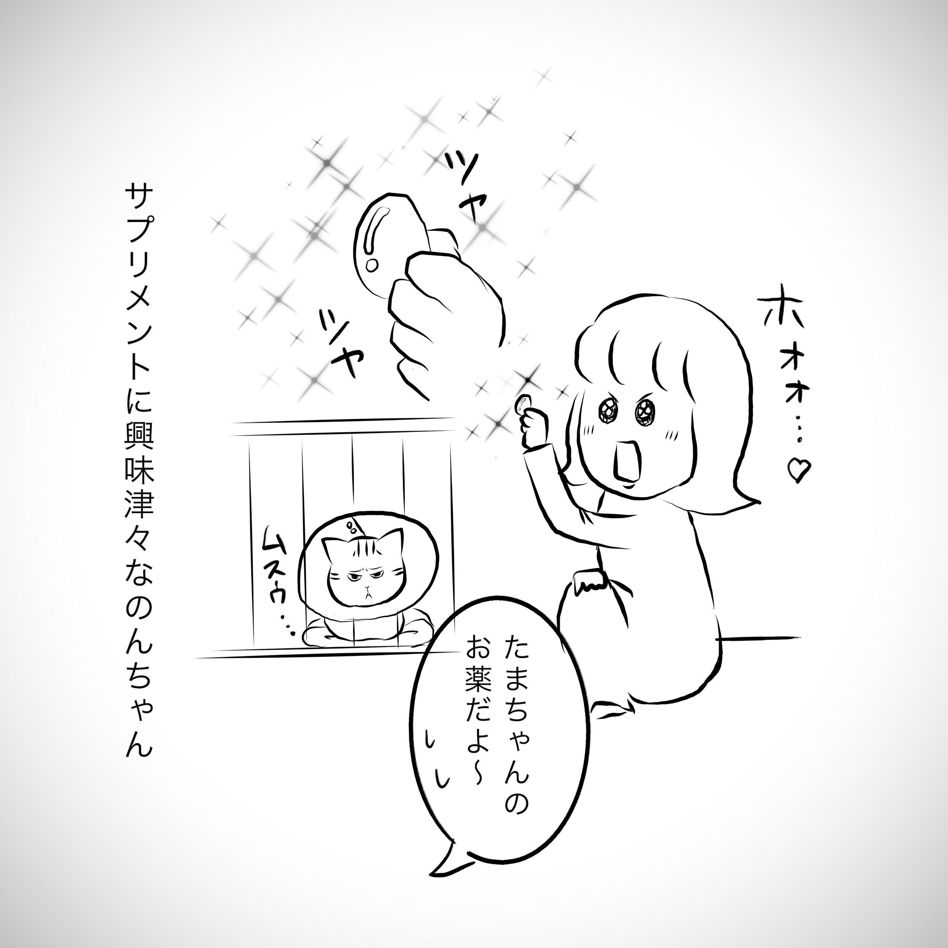 キラキラ☆な「猫のサプリ」に2歳の娘が『愛情』を吹き込む!早く元気にな~れ【連載】交通事故にあった猫を拾いました#16