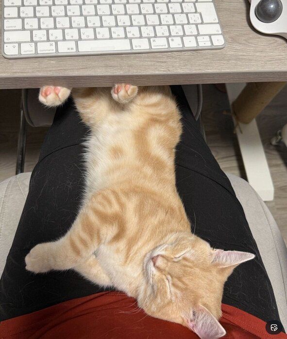 在宅ワーク中、膝の上でスヤスヤ眠る子猫。オンライン会議中も爆睡する姿に「湯たんぽみたい」と飼い主さん。癒しの光景が「羨ましい」と話題になっていました。