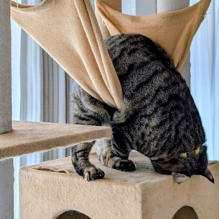 @X5M2u5OhMyIdYpxさんの愛猫・たまちゃんのハンモックの使い方が独特すぎました。キャットタワーに頭がめり込んだような姿勢になっていますが、いったい何をしていたのでしょうか? 強烈なインパクトを与える話題の投稿を紹介します。