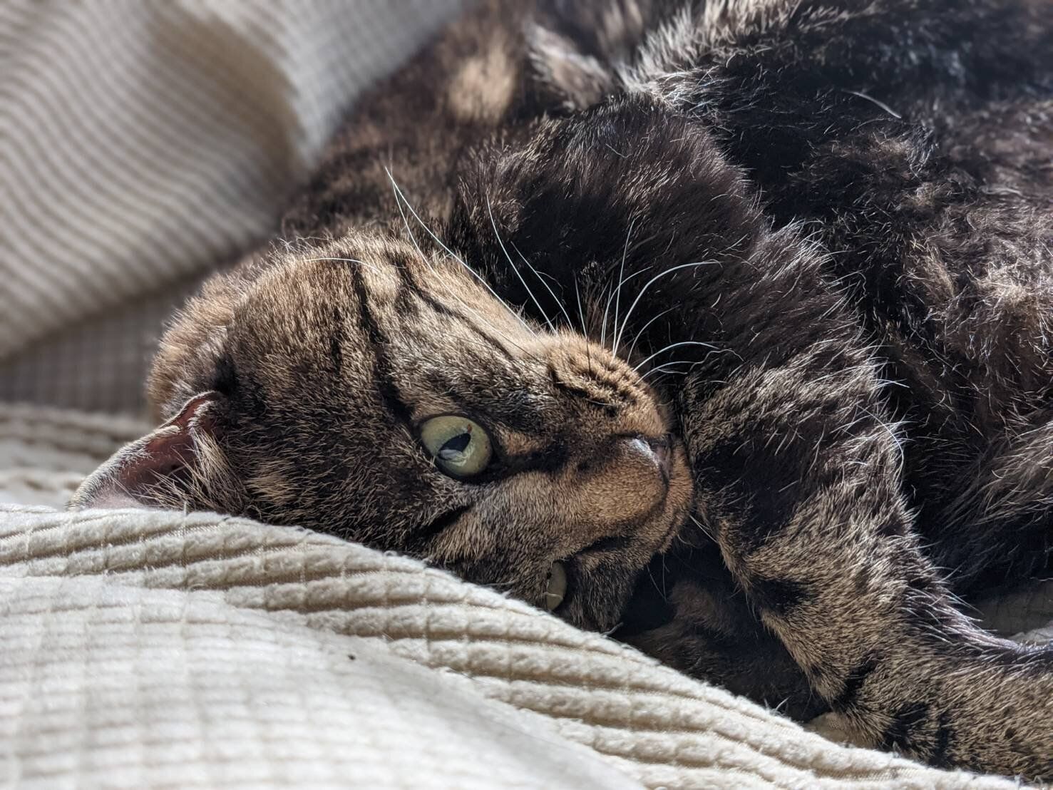 紹介するのは、X(旧Twitter)ユーザー@pushu_gubiさんの愛猫・神楽ちゃん。飼い主さんに頭を向ける写真に約6.5万のいいねが付いて話題になった神楽ちゃんについて、飼い主さんに詳しい話を伺いました。