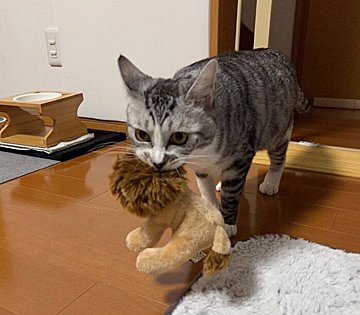2階から“ライオンのぬいぐるみ”を運んでくる元保護猫 毎日続く健気なルーティンに、家族もほっこり