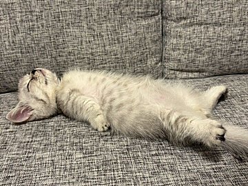 ソファの上で大胆に“ヘソ天”するマンチカンの子猫 寝落ちっぷりが「おじさん」のようだと反響
