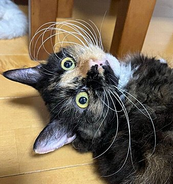 あどけなかった子猫が、今では“立派なヒゲ”をたくわえた姿で多くの人を魅了しています。お迎えして間もないころに撮影したエカちゃん(撮影時、生後5カ月)。@Pe8pydM4cHey0Zu紹介するのは、X(旧Twitter)ユーザー@Pe8pydM4cHey0Zuさんの愛猫・エカちゃん(取材時1才/ラパーマ)。こちらは、家族に迎えて間もない生後5カ月ごろの一枚です。エカちゃんは飼い主さんとじゃれあっていたようで、瞳孔が開き気味の“キュルキュルンな顔”をしていたのだとか。「子猫時代はあっという間なので、とにかく