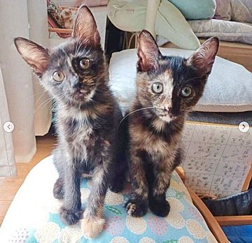 写真を比較してみると、サビ猫姉妹の成長ぶりに思わず頬がゆるみます。生後2カ月のサビ猫姉妹・ツヴェちゃんとエルちゃん(写真左から)ツヴェちゃん、エルちゃん。お迎えしたばかりのころの2匹。@mamecco_fukafuka紹介するのは、Instagramユーザー@mamecco_fukafukaさんの愛猫・エルちゃん(撮影時、生後2カ月)、ツヴェちゃん(撮影時、生後2カ月)の成長ビフォーアフター。こちらは、2匹を家族に迎えたばかりのころに撮影した一枚。スツールの上に寄り添って座る、あどけない姿が印象的です。