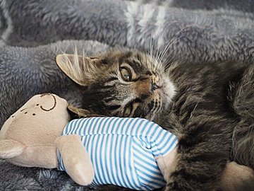 エキゾチックショートヘアの成長ビフォーアフター。子猫時代のもずくくん おもちゃより小さな体が印象的な1枚@mozuku0518今回ご紹介するのは、X(旧Twitter)ユーザー@mozuku0518さんの愛猫でエキゾチックショートヘアのもずくくんです。この写真は、もずくくんが生後3カ月のときに撮影されたもの。当時はまだおもちゃのエビと同じくらいのサイズ感だったもずくくんですが、現在は4才になり、すっかり大きく成長したのだといいます。そんな現在のもずくくんの姿がこちら。成長後の様子 すっかり大きくなったも