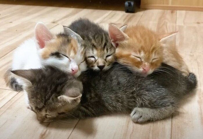 保護猫の里親を探す活動をしているアカウント主さん。こちらの子猫ちゃんたちも、大事に育てられています。ある日、アカウント主さんが子猫ちゃんたちがいる部屋をのぞくと……なんと4匹がくっついて寝ていました! いつまでも見守っていたくなる動画です。
