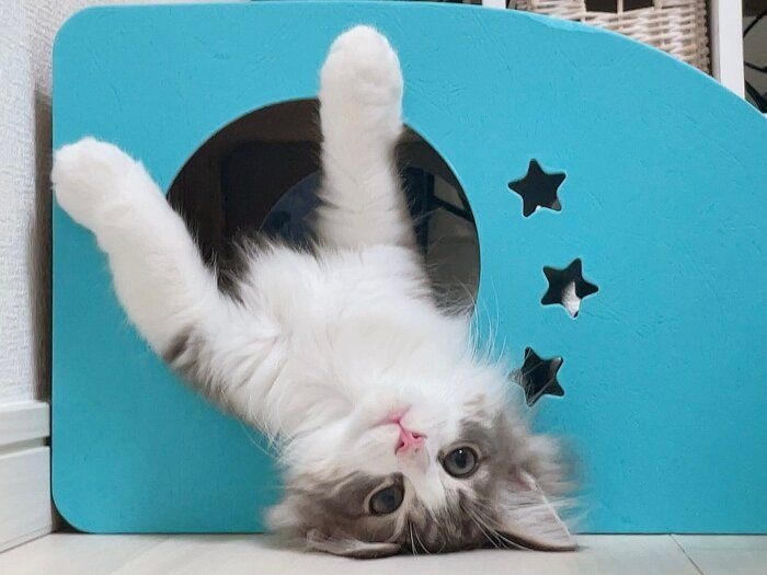 紹介するのは、X(旧Twitter)ユーザー@kedama0224さんが投稿していたこちらの写真。「ひっくり返って両前足を上げる」という可愛らしいポーズをしている愛猫・kiriくん(撮影時、生後3カ月)の姿が写っています。お迎えしてまだ1カ月も経っていない頃に撮った写真とのことですが、撮影時はどのような状況だったのか、飼い主さんに話を聞きました。