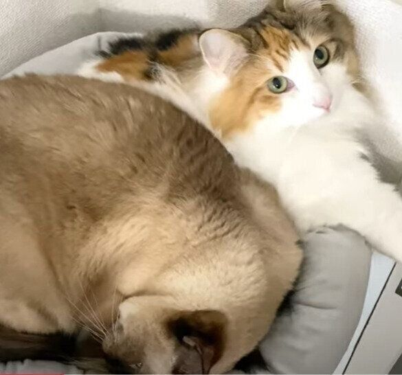 妹猫のベッドに無理やり体をねじ込む兄猫 仲良すぎの猫たちに癒される