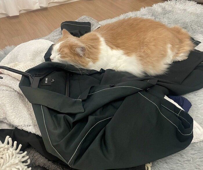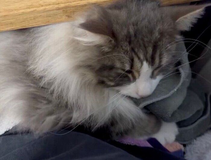 紹介するのは、X(旧Twitter)ユーザー・猫大学さん(@pari2mofu2)が投稿していた写真。洋服の上に乗って眠っている愛猫・博士くん(撮影時3才/ノルウェージャンフォレストキャット)が写っています。飼い主の猫大学さんに話を聞くと、実は博士くんがいる場所は「取り込んだばかりの洗濯物の上」だったそう。洗濯物をすべて取り込み終えて部屋に戻ったところ、猫大学さんは写真のような光景を目にしたのだとか。