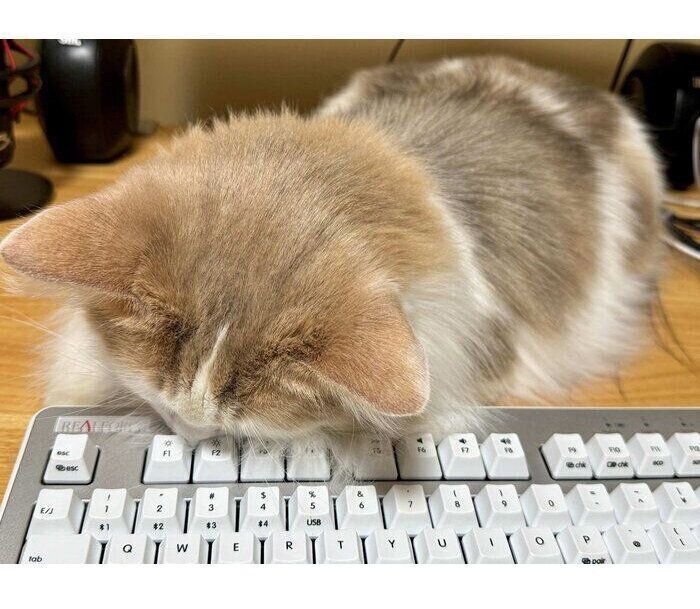 紹介するのは、X(旧Twitter)ユーザー@Ed_rieeさんが「残業監視猫、力尽きる」と投稿していた写真。キーボードに突っ伏している愛猫・エドくん(取材時4才/ノルウェージャンフォレストキャット)が写っています。飼い主さんのコメントどおり、エドくんの姿は“力尽きる”という表現がピッタリ(笑) Xで2.5万件の「いいね」(2025年5月19日時点)がつくなど大きな反響があった投稿について、飼い主さんに話を聞きました。