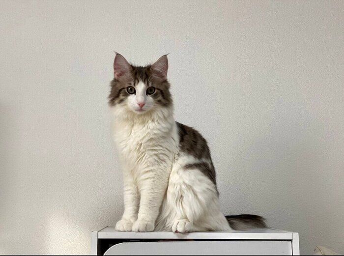 紹介するのは、X(旧Twitter)ユーザー@anmitu_0120さんの愛猫・あんみつちゃん(取材時1才/ノルウェージャンフォレストキャット)。こちらは、生後7カ月のころのあんみつちゃんです。まだ子猫のあどけない表情が可愛らしい一枚です。そんなあんみつちゃんは、2025年1月の誕生日で1才になりました。どのようなコへと成長したのでしょうか。
