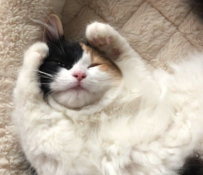 紹介するのは、X(旧Twitter)ユーザー@haru86_calicoさんが投稿していた写真。体をクネっとさせた可愛らしい“ヘソ天”寝をする愛猫・羽留(はる)ちゃん(撮影時、生後4カ月/ノルウェージャンフォレストキャット)が写っています。気持ちよさそうにスヤスヤ眠っている羽留ちゃん。両前足を顔の横に持ってきたポーズは、まるで「まる」を作っているみたい? 可愛らしい寝姿に、思わずフフッと笑みがこぼれてしまうんです。