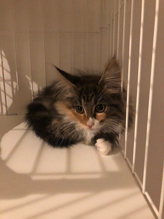 紹介するのは、X(旧Twitter)ユーザー@valkyrie_rfさんの愛猫・紬ちゃん(取材時4才/ノルウェージャンフォレストキャット)。こちらは、飼い主さんが紬ちゃんをお迎えした日に撮影した1枚。ケージの隅で小さく体を丸めている様子が愛らしいですね。