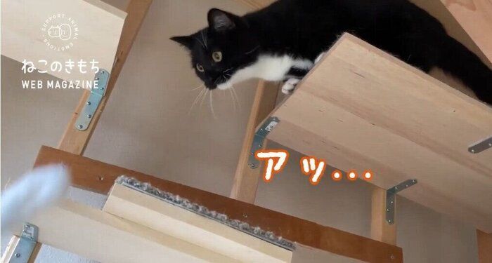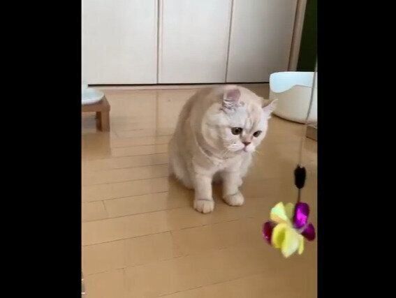 じゃらしに夢中になっているうにくん、遊んでいたらうっかり落としてしまいました!一生懸命追いかけ、キャットタワーをトン、トンと降りていきます。遊びといえど真剣なうにくんの様子にキュンとしちゃう動画です♪