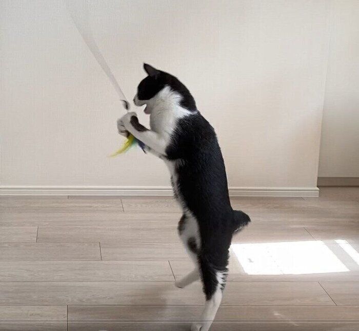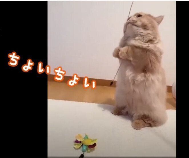 ねこじゃらしで飼い主さんと遊んでいるにこくん♪にこちゃんがちょいちょいっとしているのは、まさかの…ただのヒモ!楽しみ方は自由だよね、にこくん♪