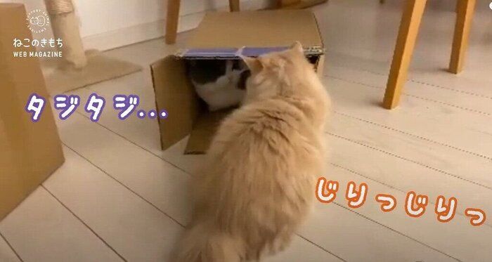 段ボールが大好きなココタくん。中に入って落ち着いています♡ するとそこへ妹のコイちゃんが登場!見つめ合いがはじまり…可愛い2匹に緊張感が走ります♪