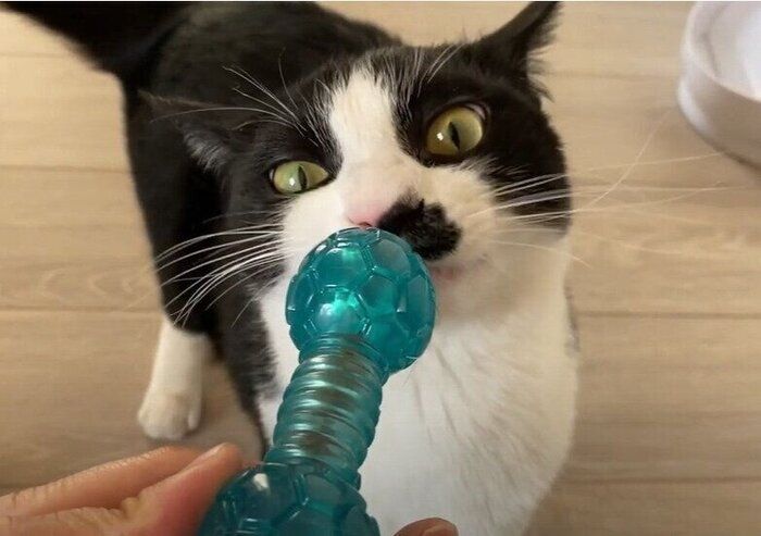 八郎くんがカミカミしているおもちゃは噛むと横からおやつが出てくる仕組みですが、実は犬用の知育おもちゃ。猫でも遊べるように…と飼い主さんが少し手を施してくれています。しかし八郎くん、もうこのおもちゃには飽きてしまったのかあまり興味を示しません(笑)マイペースな八郎くんに癒される動画です♪