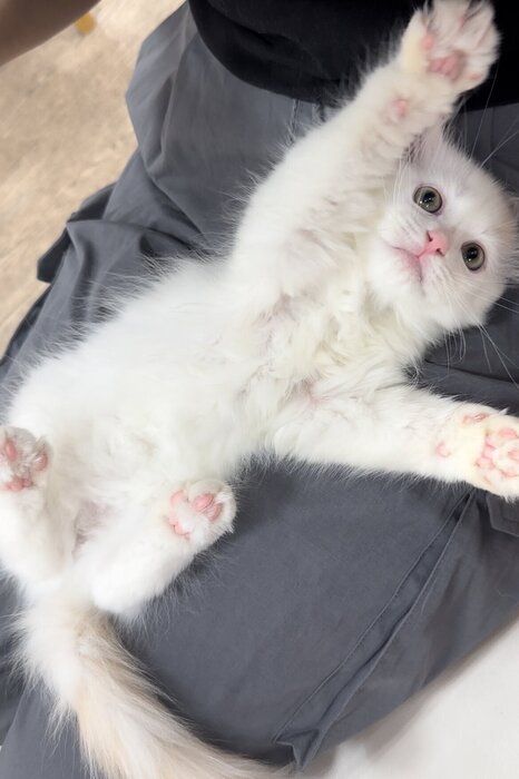 お迎え当初は「真っ白でパヤパヤだった」生後4カ月の子猫→1年で大きく成長し、モフモフになった姿にほっこり!