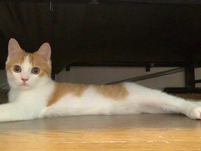 @ruuhukurouさんの愛猫・麦ちゃん(取材時4才/マンチカン)。こちらは、生後5カ月のころの麦ちゃんがベッドの下に隠れているところを撮影した一枚。飼い主さんによると、お迎え当初の麦ちゃんはベッドの下などにすぐに篭ってしまう「ビビリなコ」だったそうです。