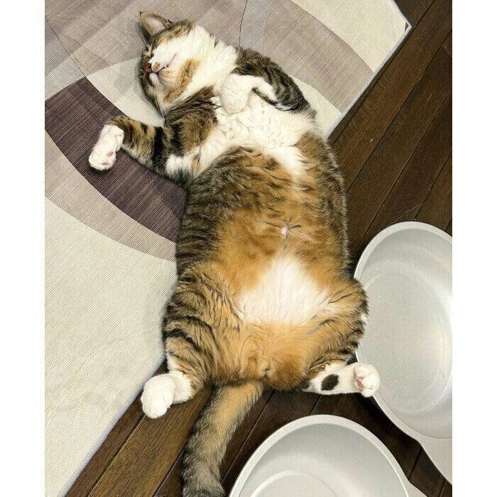 近くにある「冷んやりグッズ」を完全にスルー! ヘソ天姿で床に“落ちてる”猫の豪快な寝姿が笑える