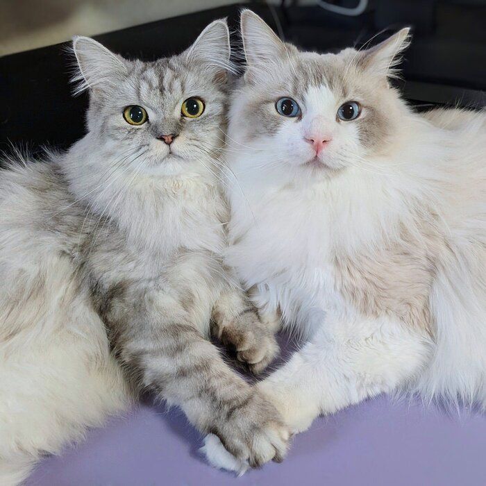 紹介するのは、Instagramユーザー@leo_and_tinaさんの愛猫・レオくんとティナちゃん(ともに取材時5才/ノルウェージャンフォレストキャット)。1枚目は、1才のレオくんとティナちゃんを撮影した写真です。お迎え当初から仲良しだったという2匹は4年後、どんなコたちに成長したのでしょうか?