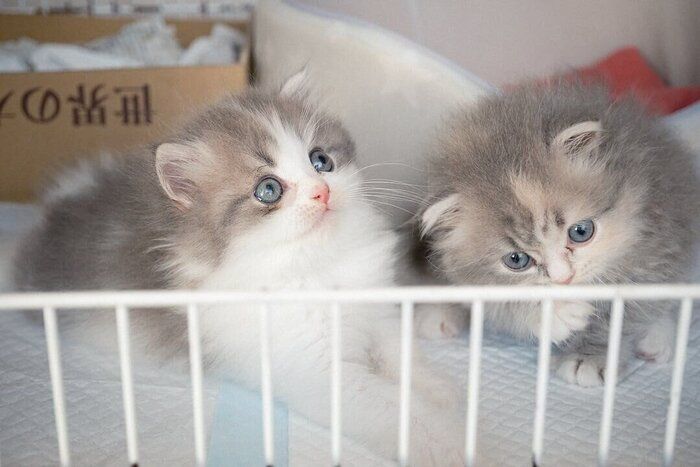 X(旧Twitter)ユーザー@uni_hotate__さんの愛猫・ほたてくんとうにちゃん(2匹ともに、取材時生後6カ月/ミヌエット)。こちらは、飼い主さんにお迎えされる前の、生後1カ月のほたてくんとうにちゃん。小さな体とあどけない表情にキュンとしてしまいますね。