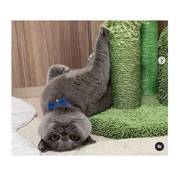 Instagramユーザー@torotorototoro269さんの愛猫・トロくん。爪とぎポールにギュッとしがみついていたのですが、なぜか突然、トロくんは首をぐわんっとすごい角度に曲げ、爪とぎポールにぶら下がりながら飼い主さんを挑発するような表情に。この行動からどのような心理が読み取れるのか、ねこのきもち獣医師相談室の岡本りさ先生が解説します。