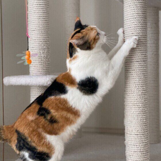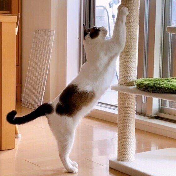 X(旧Twitter)ユーザー@shipponikukyuさんの愛猫・ちょびくんは、タワー型爪とぎ器の「柱の部分」でばかり爪をとぐそう。爪とぎの向きや目の荒さなど、猫にもこだわりがあるのでしょうか?ねこのきもち相談室の獣医師に聞きました。