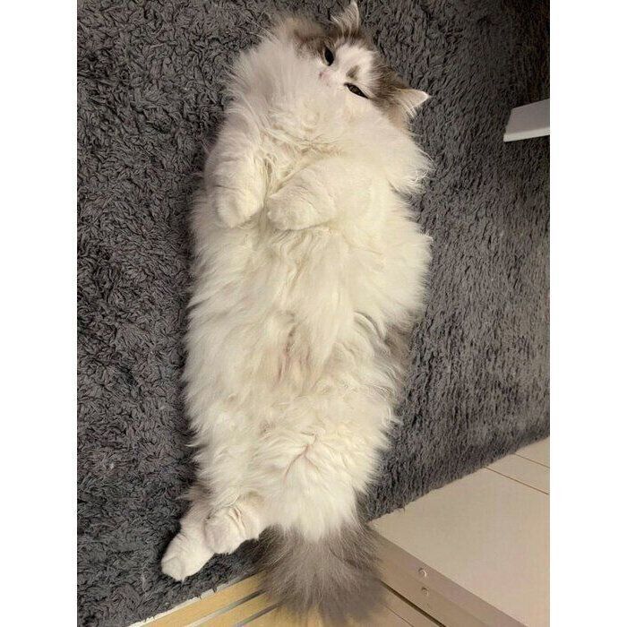 紹介するのは、X(旧Twitter)ユーザー@amechan2384さんが投稿していた、愛猫・あめちゃん(取材時1才9カ月/オス)の比較写真。まずこちらは、2025年1月に撮影した「冬毛」のあめちゃんです。日頃から気がつくとそこら辺でよく“ヘソ天”しているといい、その様子を何気なく写真におさめたそう。モフモフっぷりが印象的な可愛らしい一枚! そんなあめちゃんは、4カ月後に驚きの姿を見せていたようです。