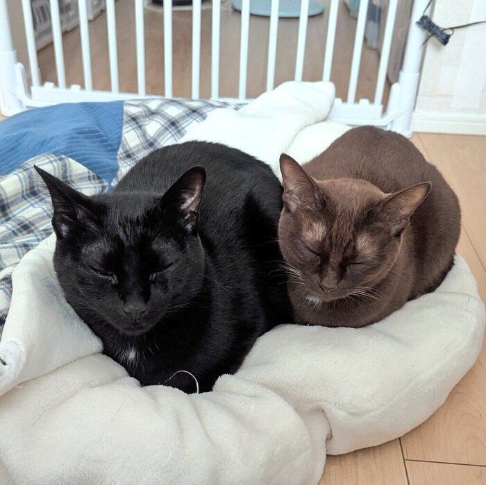ご紹介するのは、Xで約4.9万件「いいね」が寄せられた話題の1枚。写っているのは、@B7G6jさんの愛猫・うにちゃんとむぎちゃんです。今回は飼い主さんに取材を行い、当時の状況や2匹のふだんの様子について教えていただきました。