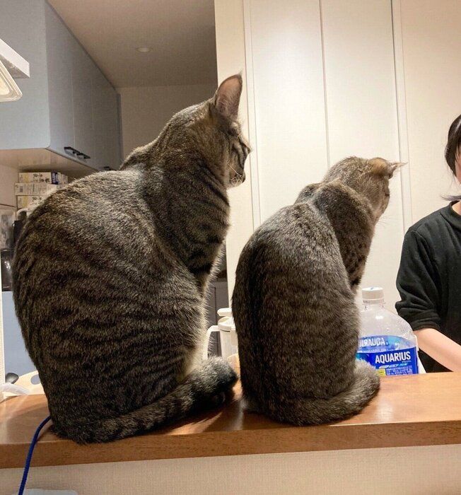 洗い物中の飼い主さんをじっと見守る2匹の猫 「シンクロした後ろ姿」にほっこり!