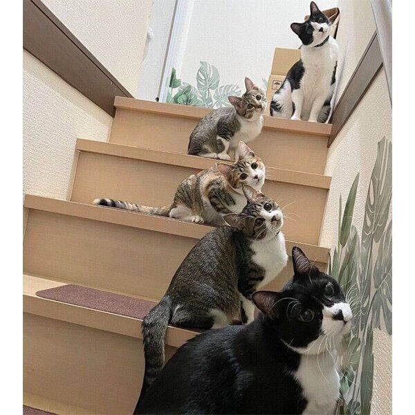 階段で一列に並んで首をかしげる5匹の猫 見事なシンクロ姿に「幸せのねこ階段」「かわいいポーズ勢ぞろい」