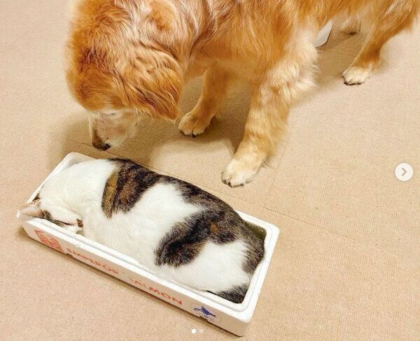 一緒に暮らす犬も心配するレベル!? 箱の中にみっちみちに詰まる猫の「収納力」がスゴい