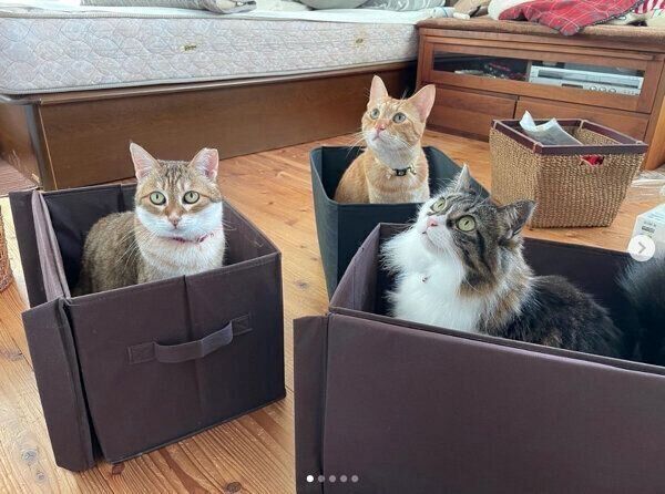紹介するのは、Instagramユーザー@chiimomorickyさんが投稿していたこちらの写真。そこには、収納ボックスの中に入る愛猫・なるちゃん(撮影時推定6才)、ノイくん(撮影時推定2才)、ルナちゃん(撮影時推定2才)の姿が。箱好きな猫たちの可愛らしい姿ですが、じつはこのとき、飼い主さんはウォークインクローゼットの片づけ中だったのだとか! 猫たちの邪魔可愛い行動から読み取れることを、獣医師に聞きました。