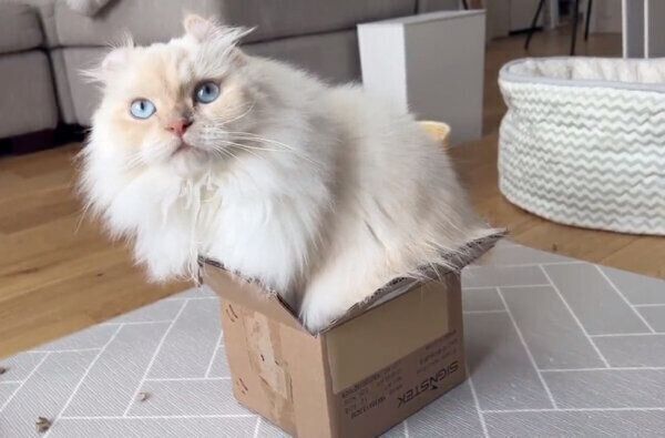 段ボール箱にすっぽり入る猫 自分より小さい箱にも“ぎっちぎち”に入る姿がかわいいと話題に