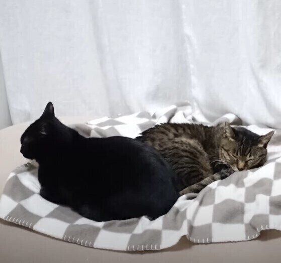 猫のニコちゃんとルナちゃんとともに、2週間ほど帰省していた飼い主さん。2匹の仲はそれまで思うようにうまくいっていなかったようですが、帰省を終えて自宅に帰り、夜になると一緒に寝る2匹の姿がありました。動画です。