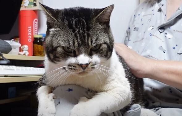 険しい表情でパパの膝に乗る猫→本当は嬉しくてリラックスしているツンデレちゃん♡