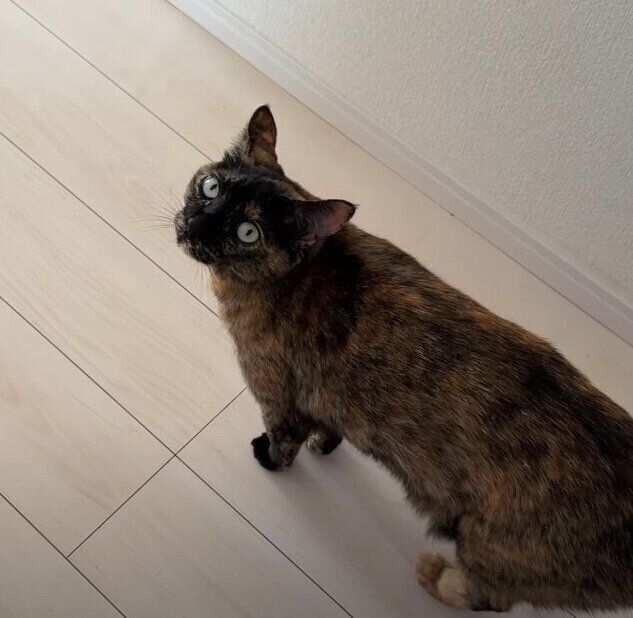 大きな鳴き声で元気に2階へ駆け上がってくる、サビ猫のモモちゃん。モモちゃんは、朝はママさんとパパさんに朝のあいさつをするのだそう。2人のもとへきちんと立ち寄るモモちゃんがかわいい動画です♪