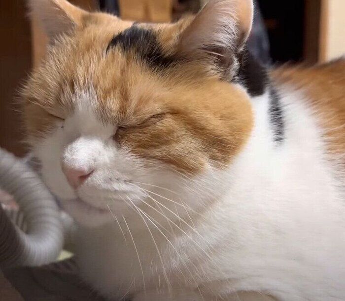 お鼻の汚れをほじられても……ゴロゴロ甘えちゃう三毛猫がかわいい♡