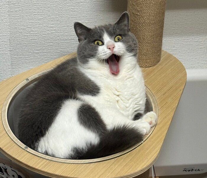 紹介するのは、X(旧Twitter)ユーザー@taro20216さんが「#ギリギリネコ判定選手権」のハッシュタグをつけて投稿していた写真。キャットタワーのてっぺんで2本足で立っている愛猫・たろうくん(撮影時1才半/スコティッシュフォールド)が写っています。天井をじーっと見ている様子のたろうくんですが、別の角度から見てみると……「本当に猫なのか?」と疑ってしまう?