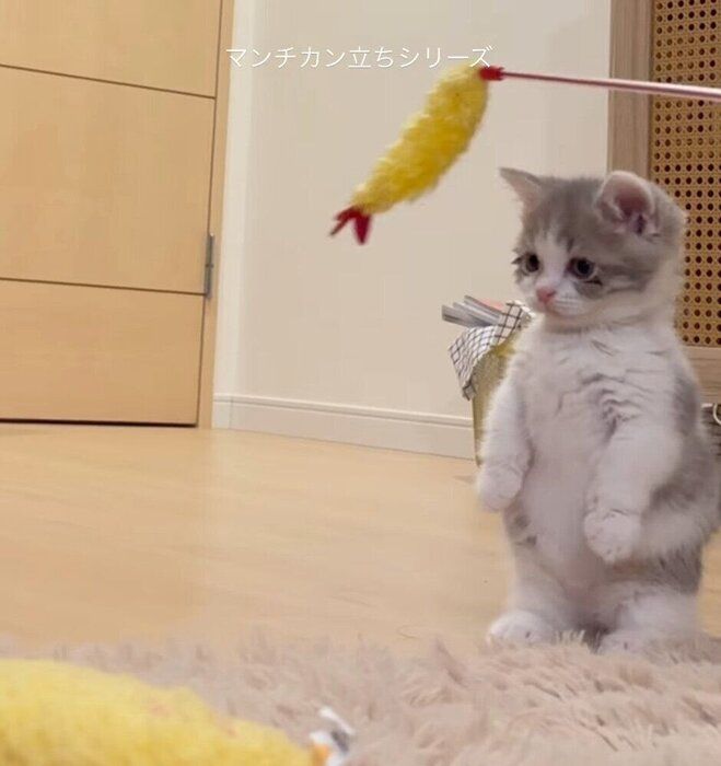 「えび天」のおもちゃを見つめる子猫、直後にスクッと「マンチカン立ち」 可愛いしぐさに悶絶!