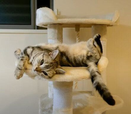 キャットタワーでくつろぐコニーちゃん♡ でも、なんだか落っこちそう! 手をクロスして、お腹を出して……なんて個性的な寝方なんでしょう♪ きっとコニーちゃんにとったら究極の楽ちん姿勢なんでしょうね。動画です!