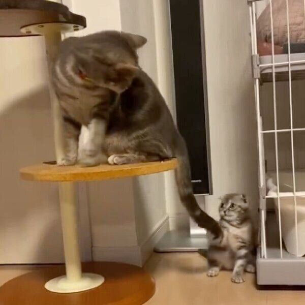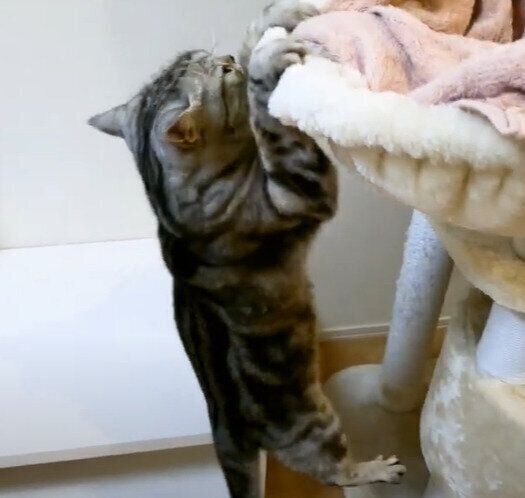 キャットタワーの上で「挙動不審」な猫、一体なぜ!? 可愛らしい理由にほっこり