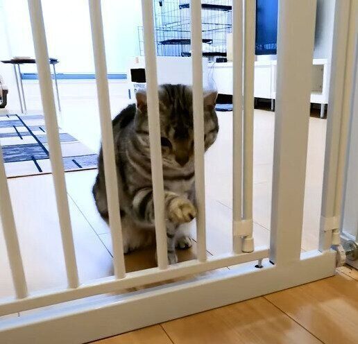 飼い主さんがおやつを準備中、我慢できずにゲートから前足を出す猫がかわいい
